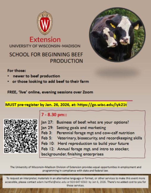 School for Beginning Beef Production Written by LORA SCHULTZ Posted on January 6, 2026January 6, 2026 Share Share:Share on FacebookShare on X (Twitter) Share via EmailCopy LinkCopied! Free, online sessions Starting at 7:00 PM Must pre-register by Jan. 26
