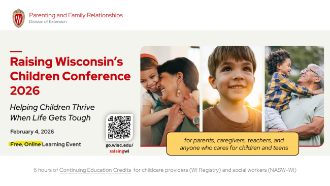 Raising Wisconsin’s Children Conference Written by LORA SCHULTZ Posted on January 19, 2026 Share Share:Share on FacebookShare on X (Twitter) Share via EmailCopy LinkCopied! Helping children thrive when life gets tough Free online course February 4th