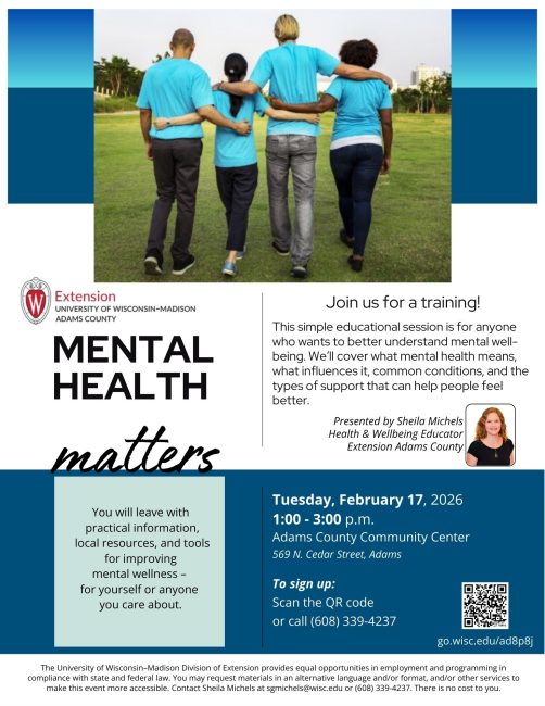 Mental Health Matter Written by LORA SCHULTZ Posted on February 6, 2026 Share Share:Share on FacebookShare on X (Twitter) Share via EmailCopy LinkCopied! Join us for a training on Tuesday, February 17th, 2026 from 1:00 – 3:00 PM at the Adams County Community Center