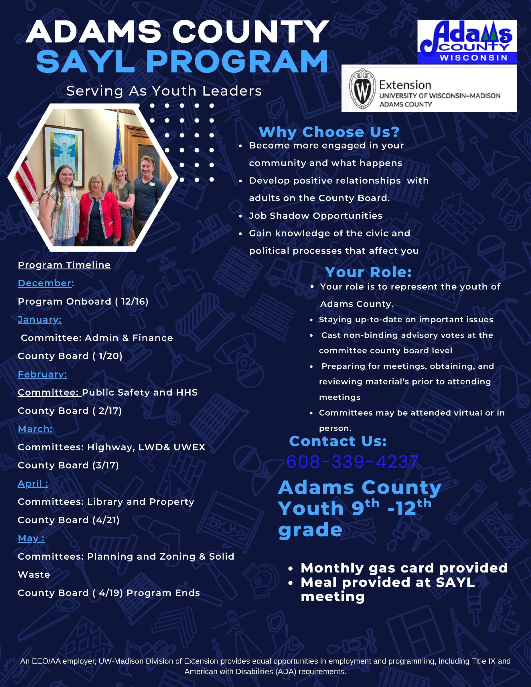 Serving as Youth Leaders (Sayl) is open to all Adams County residents 10th – 12th grade.